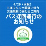 4/29(水・祝) 三条マルシェ開催に伴う「路線バス・高速バス」迂回運行のお知らせ明日開催の三条マルシェに伴う交通規制により、路線バスおよび高速バスの運行ルートが変更となります。「い...